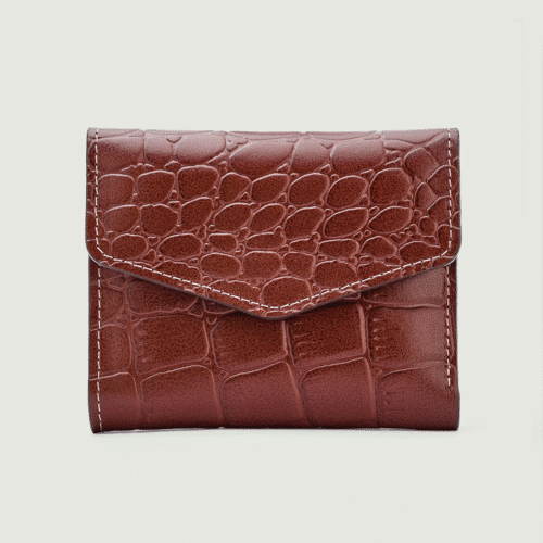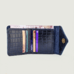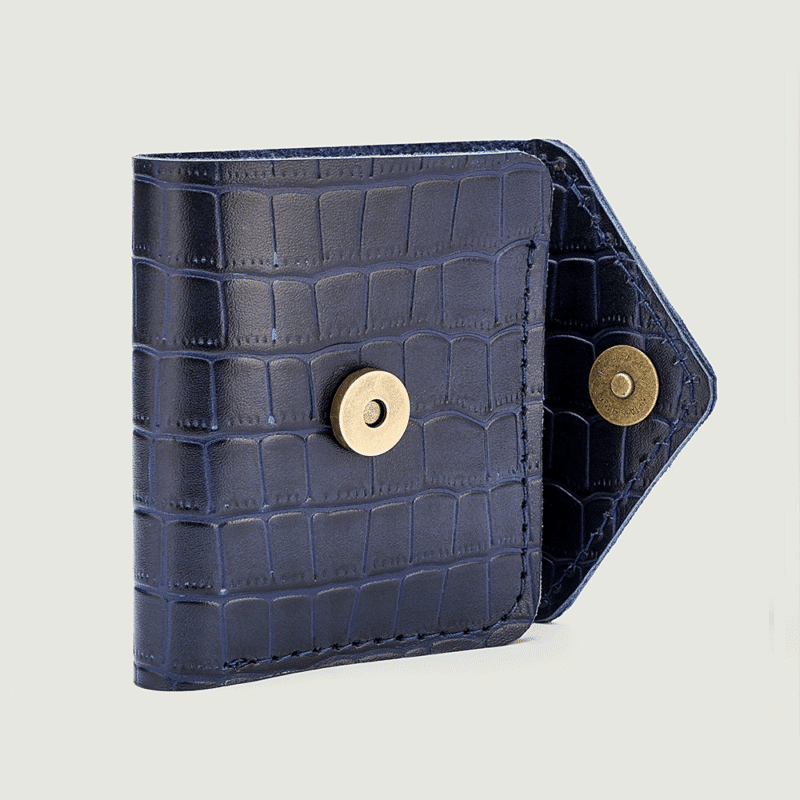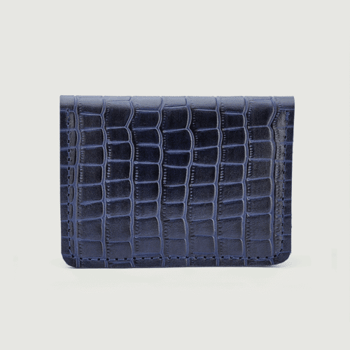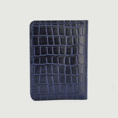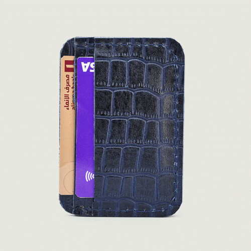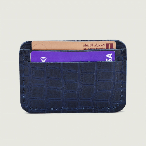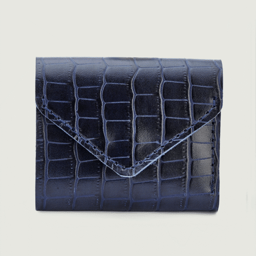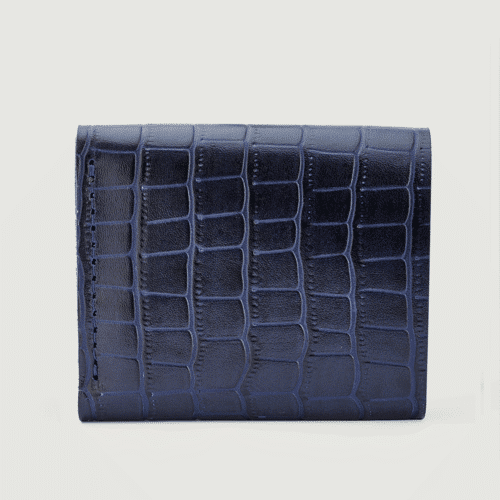 محفظة يد نسائية أنيقة بتصميم فريد من الجلد الطبيعي بلونين أزرق كحلي مع نقشة بارزة تشبه جلد التمساح. تتميز بقفل معدني عصري وتصميم داخلي عملي يتضمن: