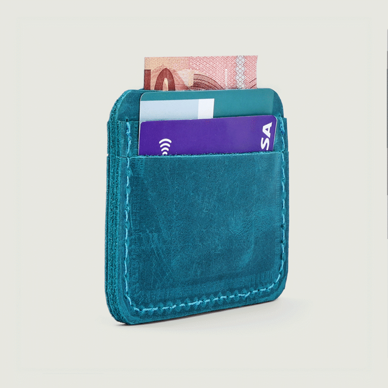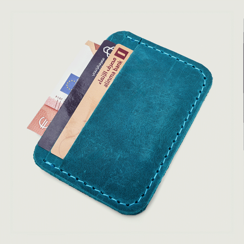 صُنع من الجلد الطبيعي الفاخر باللون الفيروزي، ويحتوي على 3 جيوب رئيسية لتضع فيها بطاقاتك الأساسية أو بعض النقود.