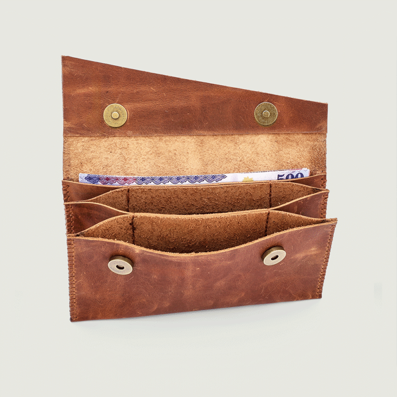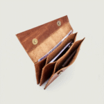 محفظة نسائية مصنوعة يدويًا من جلد طبيعي فاخر باللون الجملي الدافئ الذي يزداد أناقة مع مرور الوقت.