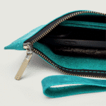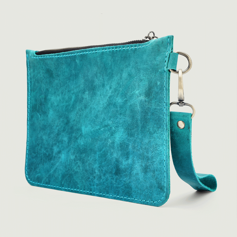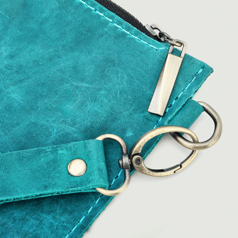 هذه الكلاتش الأنيقة مصنوعة من جلد طبيعي 100% مع لمسة نهائية ناعمة وفاخرة، بلونها الفيروزي الآسر الذي يذكرنا بجمال الأحجار الكريمة. يتميز تصميمها بكونه نحيفاً ومدمجاً، مما يجعلها مثالية لحمل أساسياتك اليومية بكل أناقة.