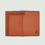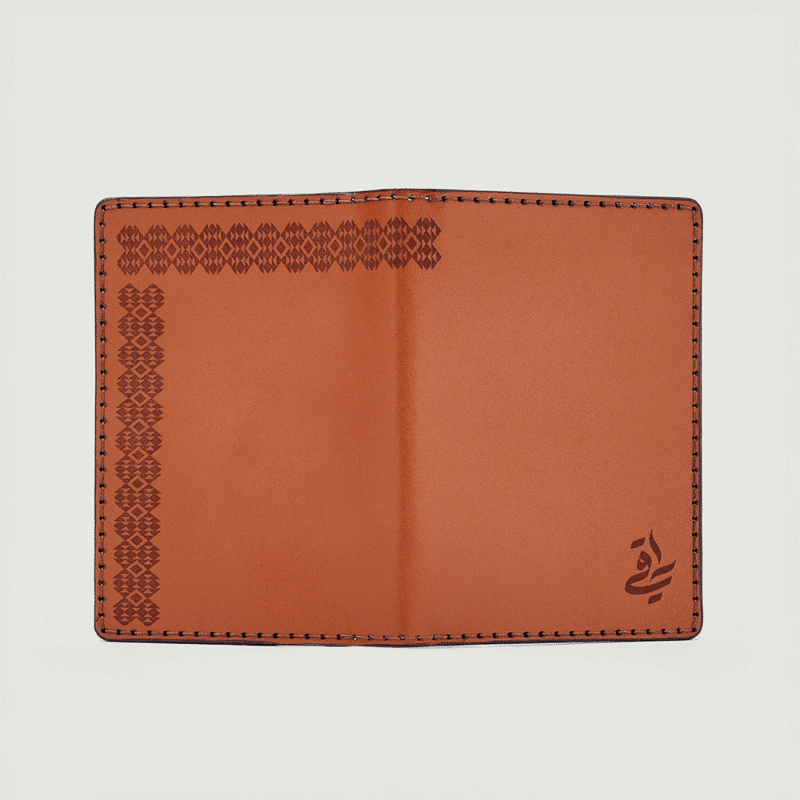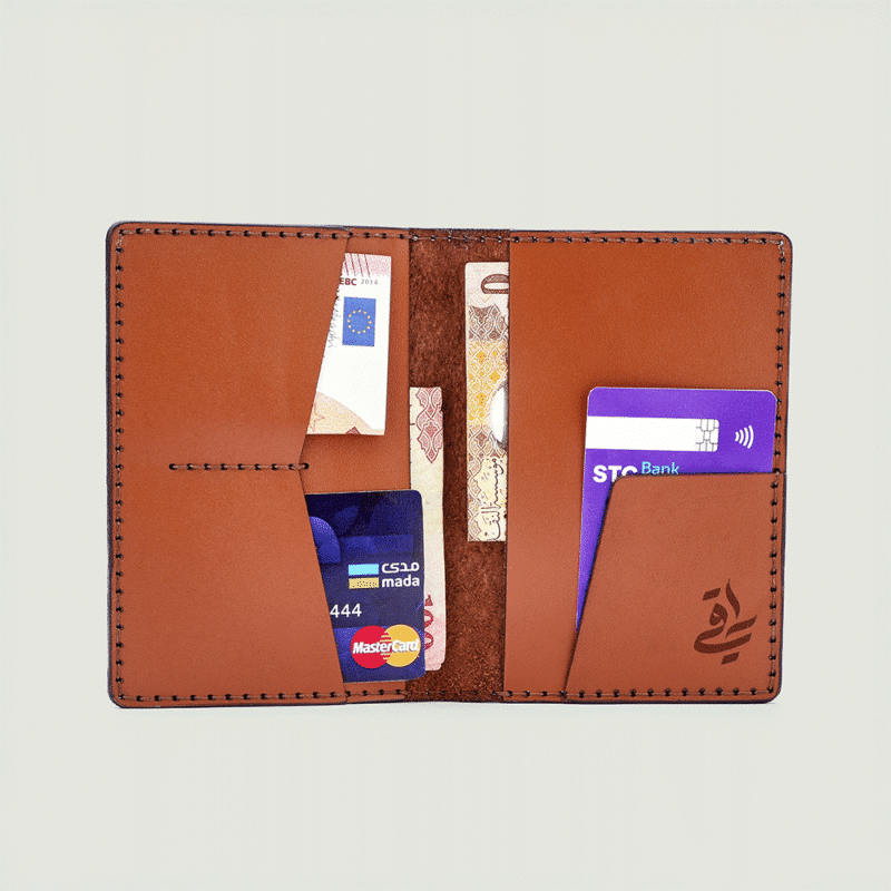 محفظة جواز السفر الأنيقة. صُممت يدوياً من جلد طبيعي 100% بلون البني الفاتح (الجملي) الذي يمنحها لمسة كلاسيكية لا مثيل لها.